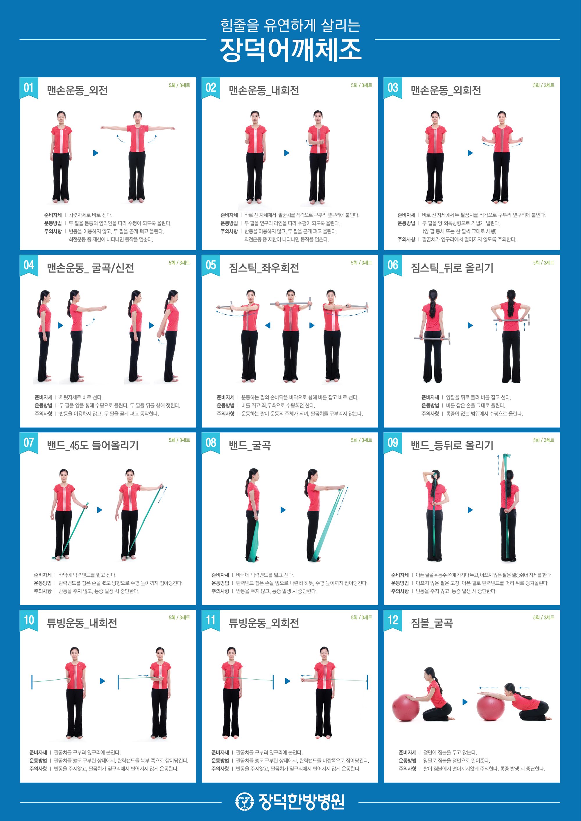 이외에도 다양하게 혼자서도 할 수 있는 오십견에 좋은 운동법을 보시려면 아래를 클릭하세요 :) 장덕의 어깨질환 예방체조_맨손운동 편 ◀ Click 장덕의 어깨질환 예방체조_짐스틱운동 편 ◀ Click |